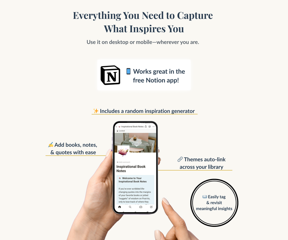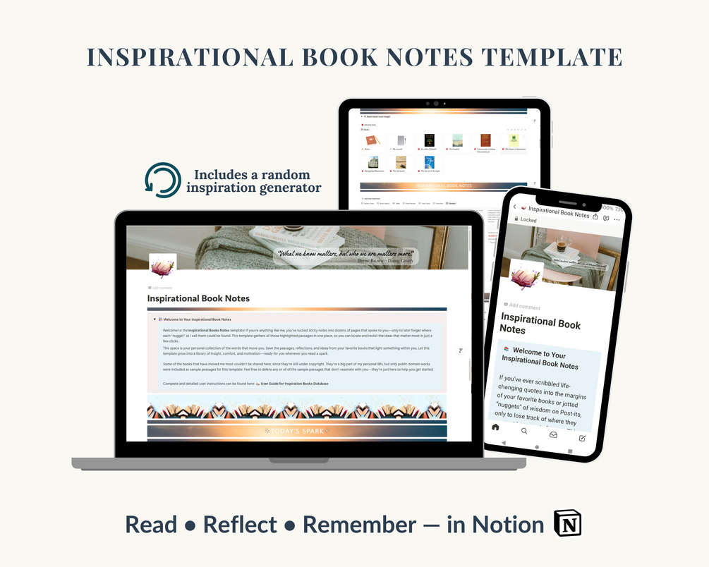 Inspirational Book Notes Dashboard | Aesthetic Notion Reading Journal, Tracker & Quote Keeper for Reflective Readers | Digital Reading Log