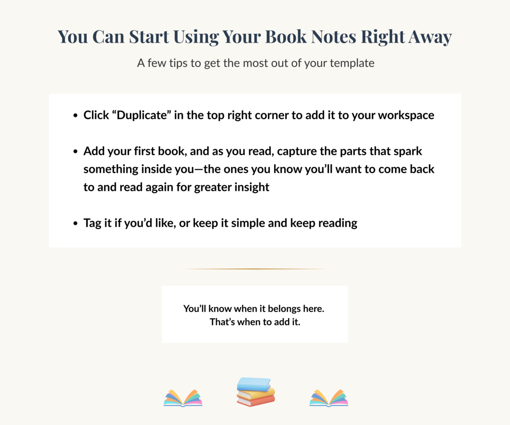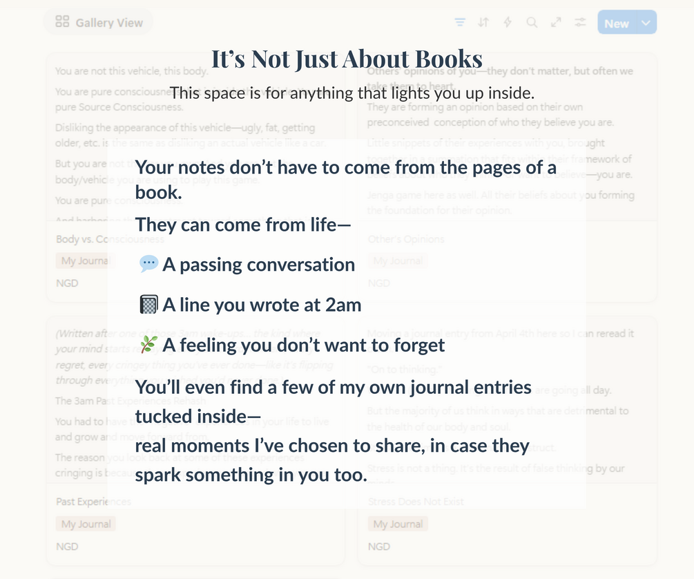 - A book notes database with space for quotes, reflections, page numbers, and key takeaways