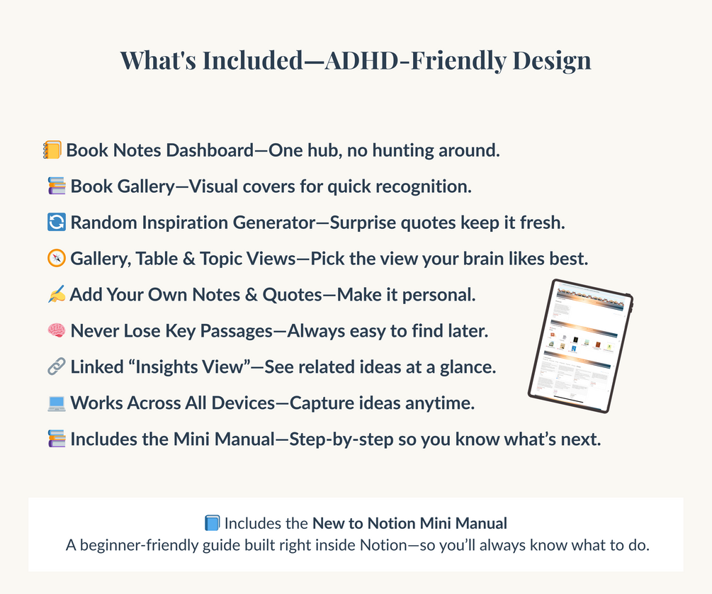 Be sure to also download the free New to Notion Mini Manual—it’s a hands-on beginner’s guide that will help you get even more out of this template.